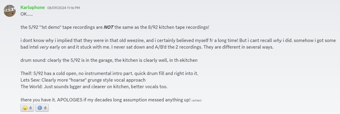 | Karl | August 8, 2024 | Discord (Recording History 2.0 thread) | Discord, Karl Koch, Weezer's first demo |