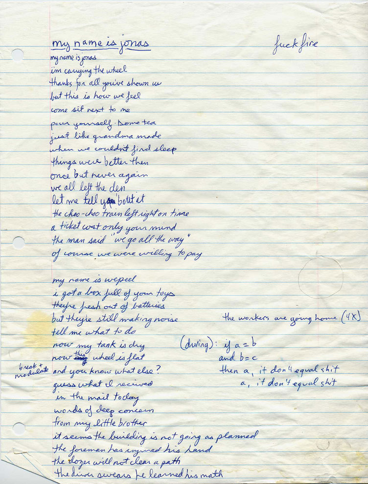 Handwritten lyrics for "My Name is Jonas"