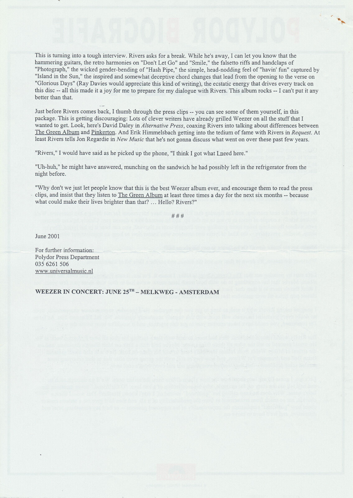 DIZQ MEMORABILIA | c. June 2001 | eBay | Weezer Polydor biography - June 2001, scanned by DIZQ MEMORABILIA on eBay. | Weezer, Weezer (The Green Album), Weezer Polydor biography - June 2001, 2001, |