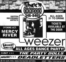 Weezer performed at Tinks in Scranton, Pennsylvania on June 19, 1997 as part of the Pinkerton Tour. Mercy River opened.