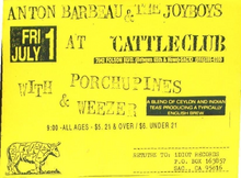 Weezer opened for Anton Barbeau & The Joyboys at Slim's in San Francisco, California on July 1, 1994 as part of the Blue Album Tour. The Porchupines also opened.