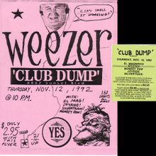 Weezer show #32: Club Dump (The Central), Hollywood - Club Dump was held Thursday nights at the Central, a Sunset Strip club in Hollywood that much later was bought, re-modeled, and reopened as the Viper Room. Way back then it was anything but glamorous. But it was one of the very few clubs that had a booking policy that made any sense, and who actually sort of catered to non-glam/metal bands. The club was run by a curious guy whose name was Yowsah! (including the "!"). Also on the bill were El Magnifico (whose drummer Jon Pikus had just engineered the bands 3rd and most official demo tape), Joyride (featuring Steve Soto formerly of the Adolescents), and 2 other bands we know little about now. Pink flyer art by Karl, the green 'standard' flyer was crudely modified by someone in the band to make Weezer's name stand out. Show setlist: unknown.