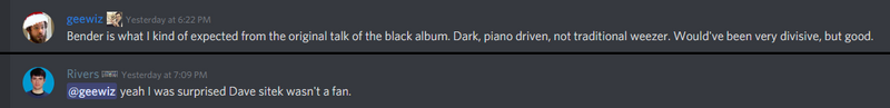 Screenshot of discussion re: Bender from "Rivers Cuomo" Discord server; October 18, 2021