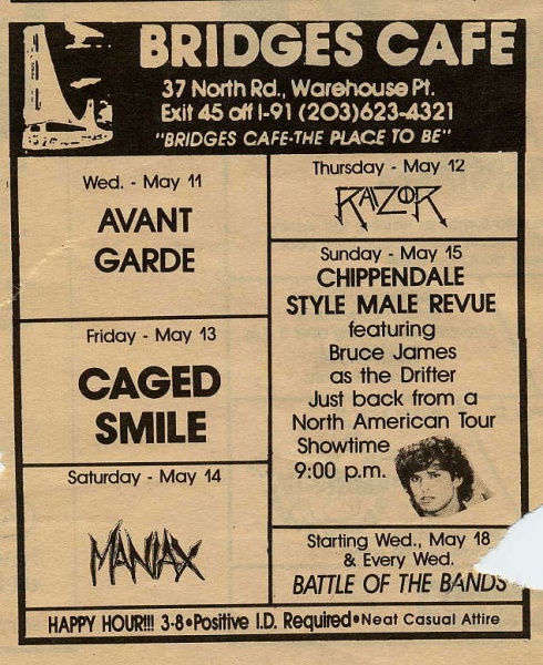 Ad promoting Avant Garde performance at Bridges Cage; May 11, 1988
