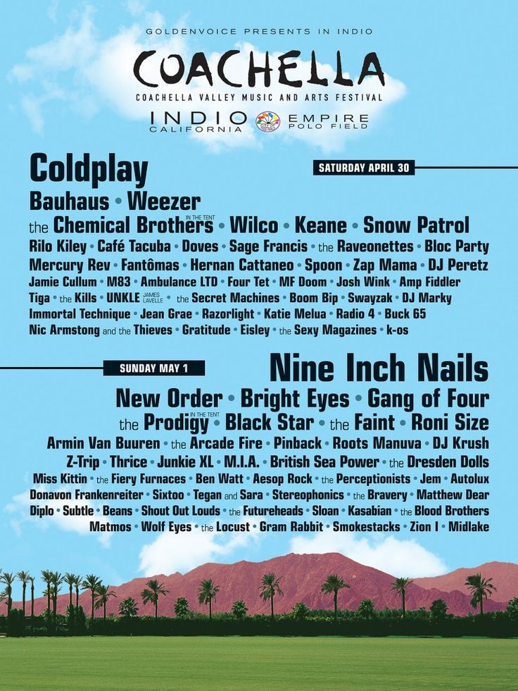 | current | 03:50, 5 April 2024 | 736 × 981 (146 KB) | Meriamory (talk | contribs) | The lineup poster for Coachella 2005. Weezer is featured for day 1, April 30th. |