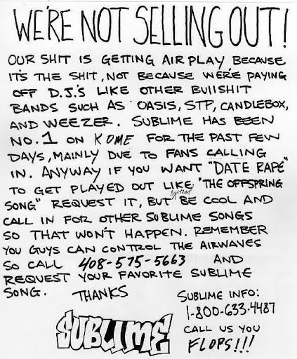 WE'RE NOT SELLING OUT! OUR SHIT IS GETTING AIRPLAY BEACUSE IT'S THE SHIT, NOT BECAUSE WER'E PAYING OFF D.J.'S LIKE OTHER BULLSHIT BANDS SUCH AS OASIS, STP, CANDLEBOX, AND WEEZER. SUBLIME HAS BEEN NO.1 ON KOME FOR THE PAST FEW DAYS, MAINLY DUE TO FANS CALLING IN. ANYWAY IF YOU WANT "DATE RAPE" TO GET PLAYED OUT LIKE "THE OFFSPRING SONG" REQUEST IT, BUT INSTEAD BE COOL AND CALL IN FOR OTHER SUBLIME SONGS SO THAT WON'T HAPPEN. REMEMBER YOU GUYS CAN CONTROL THE AIRWAVES SO CALL 408-575-5663 AND REQUEST YOUR FAVORITE SUBLIME SONG. THANKS SUBLIME INFO 1-800-633-4487 CALL US YOU FLOPS!!! SUBLIME