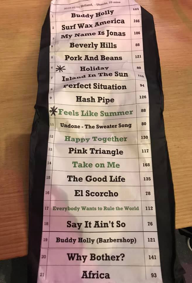 2019 July 1 Set list from Utrecht, Netherlands at TivoliVredenburg Ronda. Pic courtesy of fan clubber Mara Levy