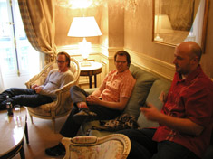 ...day 2 of 2 in Paris, again chock full of interviews and photo shoots. The day was capped off with a trip out to a television studio, where the "Hit Machine" show is taped. Upon arrival in the backstage 'green room' area, We waded through a very odd assortment of performers and entourages, which, along with weezer, apparently represent the music artists who are "on top" in France right now. What a bizarre mixture! Anyway, the guys ran thru "Island" twice for camera rehearsal, much like on Saturday Night Live, etc., then we were back to waiting around. Finally the taping began, and soon the guys were called to do it again, this time in front of a screaming studio audience. The cool thing is that about 10-20 heavy weezer fans made it to the show, braving the strange pop environment to join in the audience, and it was great to see them rocking out as best they could. But the whole audience looked pretty stoked, you could tell that "Island" has made some real impact here. Thanks to the fans and to the whole French record label staff for making the Paris visit run so smoothly and for being so nice. Everyone is stoked to return to France and all of Europe for more extensive touring as soon as the time is available!