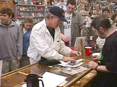 - Boogie Records, Toledo OH: "Got there, record was on, pizza was served. Fans were milling about the store...and indeed very excited. We set up an Enter To Win box and there was line to fill out ballots. Our presale included a free poster, sticker and 8x10. In the end we had 22 presales. WRWK came down and hung out all day. Now this is the cool part...Weezer bass player Scott Shriners's dad came down and preordered 2 copies of Maladroit. He was so excited about everything we had put together that he called Scott! So the phone was passed around (pics included) and everyone was excited to be able to say hi. Scott was very excited to hear about this event....in a store he tried to get hired at but never did."