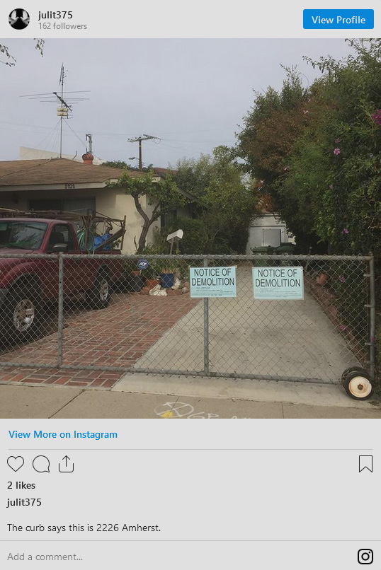 2226 Amherst Avenue, West LA. Right on the border with Santa Monica. Close to Taco Bell, Chevron. We shot the Say It Ain’t So music video here.